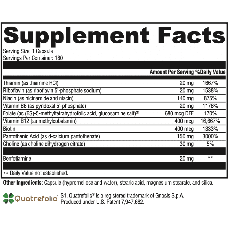 Contains the entire spectrum of B vitamins to support adrenal and neurological functions. It features activated forms of vitamins B2, B6, and B12; benfotiamine, a fat soluble, more physiologically active form of thiamine; and folate as Quatrefolic, which is proven to have greater stability, solubility, and bioavailability over calcium salt forms of 5-MTHF.